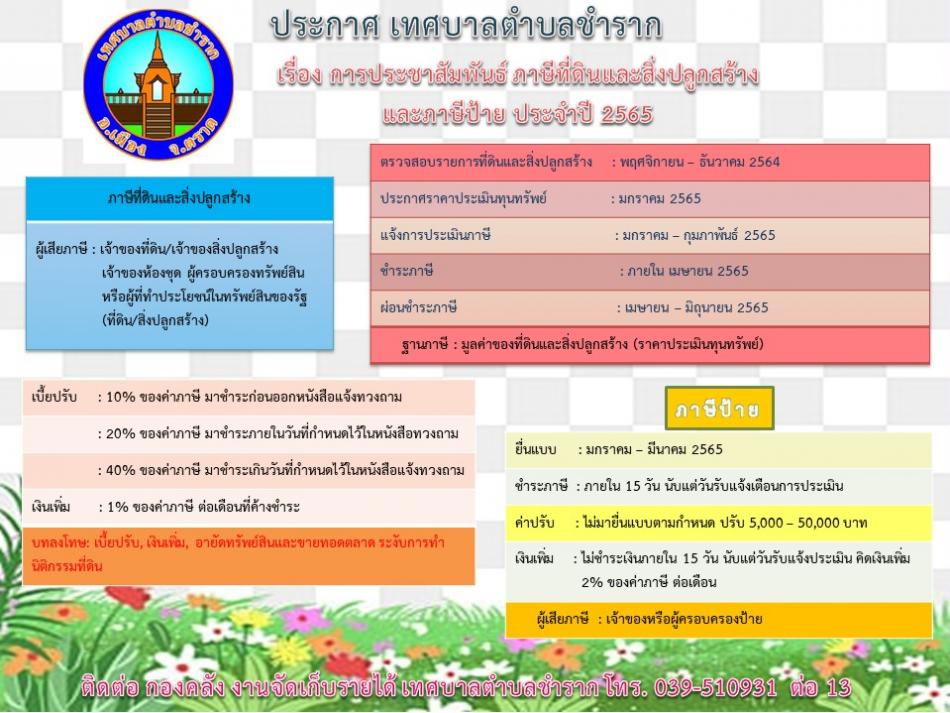 ประกาศเทศบาลตำบลชำราก เรื่อง ประกาศการชำระภาษีที่ดินและสิ่งปลูกสร้างและยื่นแบบแสดงรายการภาษีป้าย ประจำปี พ.ศ.2565 ขอให้ผู้ครอบครองที่ดินและผู้ประกอบการที่ครอบครองป้าย... [14 มกราคม 2565]