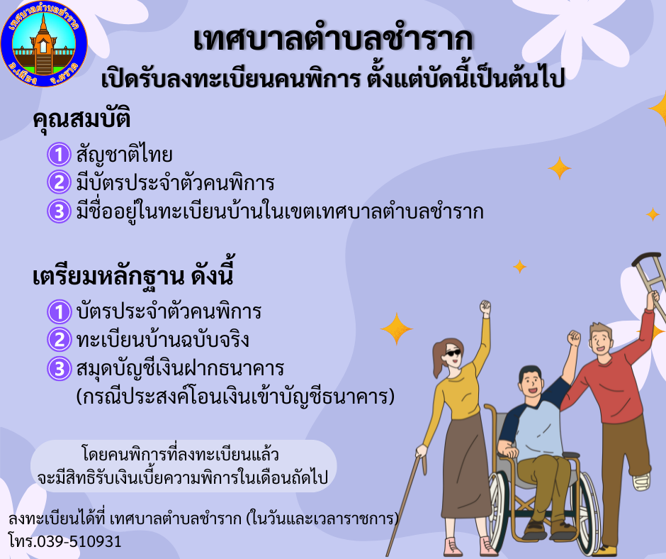 เทศบาลตำบลชำราก เปิดรับลงทะเบียนคนพิการ [8 ตุลาคม 2566]